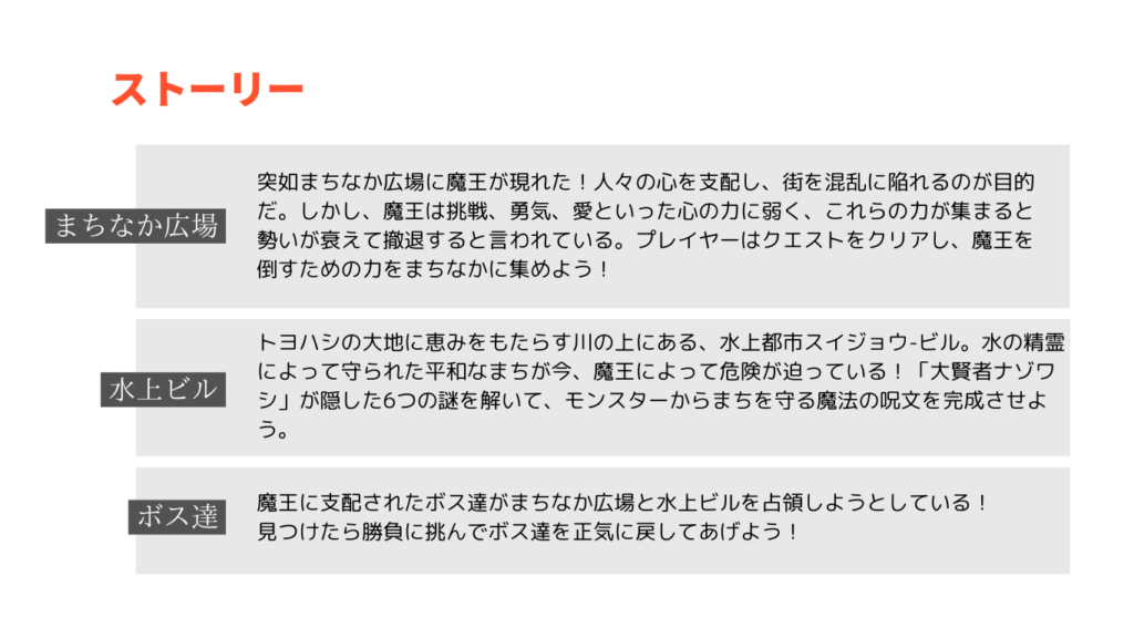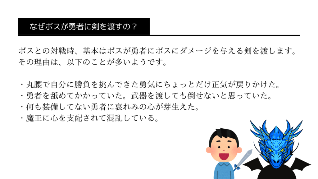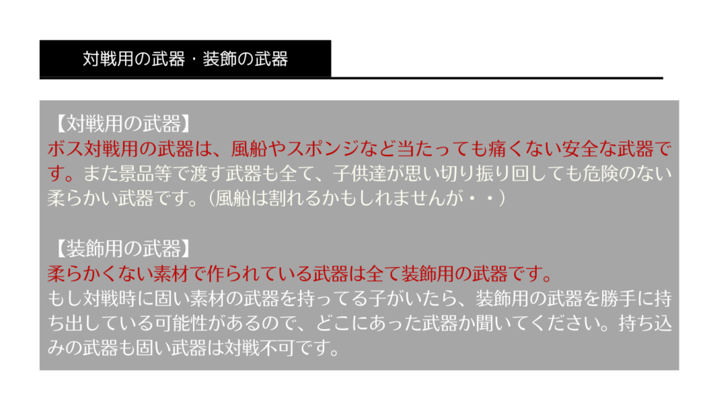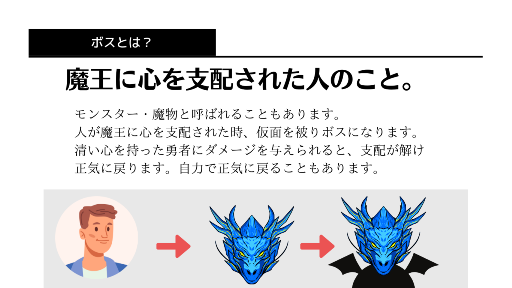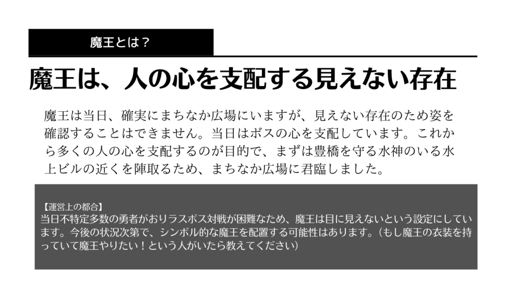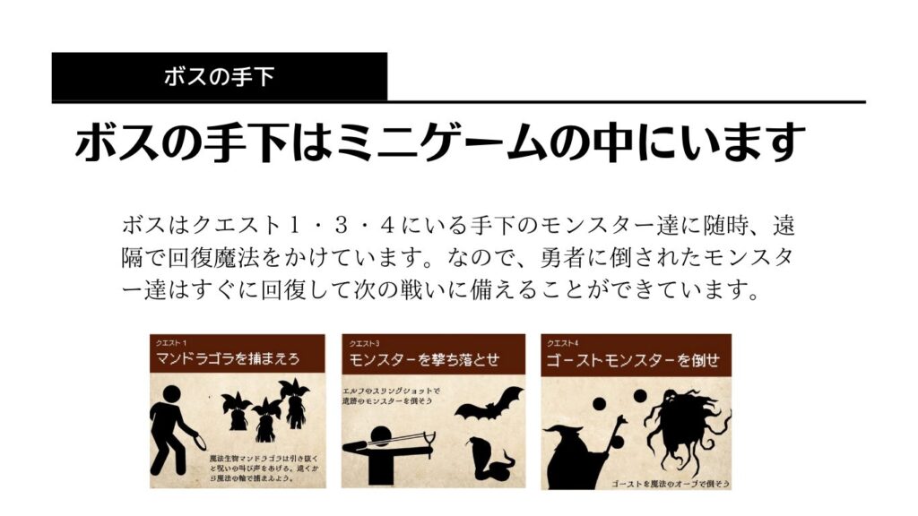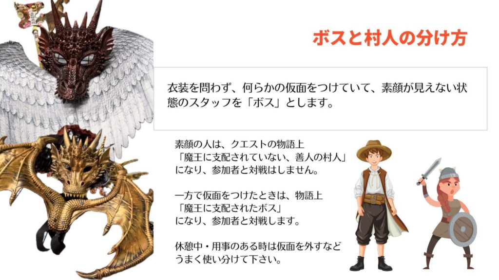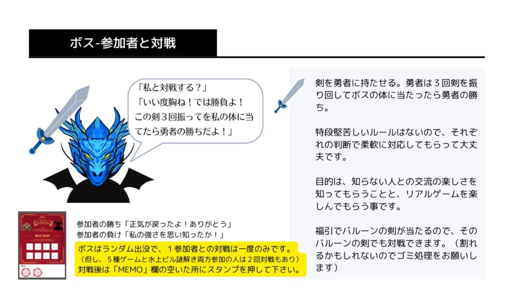 ※ボス戦の見本を考え中です。(ランダムでスタッフが勇者役・ボス役にわかれて参加者の前で対戦する演出)