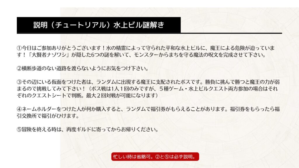 司会役・ボス役のスタッフが揃ったときに音響のりんさんと打ち合わせをして適度にデモンストレーション開催。勇者はスタッフの子供たちに事前に声をかけてください。