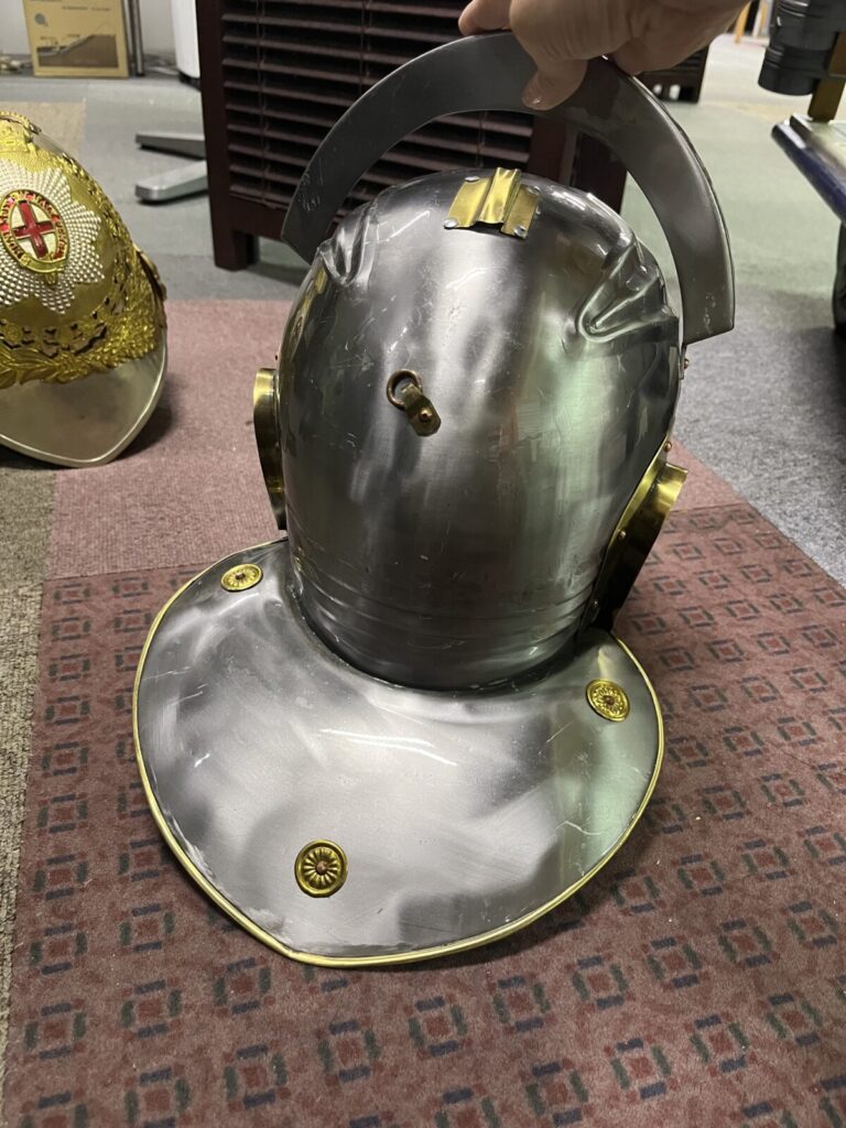 甲冑の兜。甲冑着用の場合、服の生地が甲冑にひっかかり糸が出たり小さな穴が空いたりする場合があるので、そうなってもいい服を下に着用下さい。(少し重く男性向き)